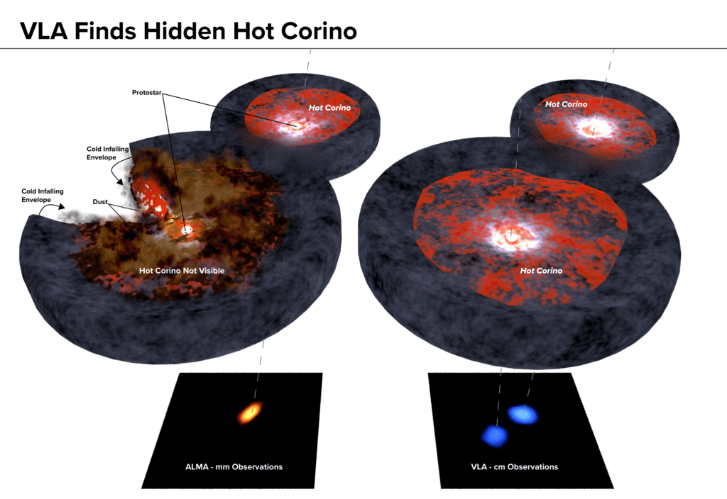 Studies of vast stellar nurseries have revealed the regions around protostars are brimming with activity. These warm, dense pockets surrounding embryonic stars acquiring the mass to sustain nuclear fusion, create a bustling region of chemistry, known as hot corinos. As the protostars feed on the surrounding dust and gas, plasma envelopes glow in the light of complex organic molecules (COMs).