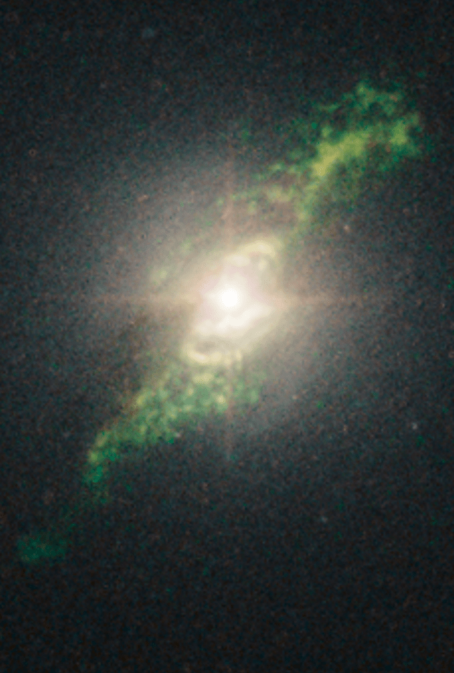 This green filament resembles a distorted double helix. Similar material is found within stellar nurseries, dense clouds of cold gas and dust intertwined with the spiral arms of galaxies, and were unexpected at such great distances from their hosts. The polar jets from the monster black holes hurl out plasma at relativistic speeds, forming extragalactic bubbles of indescribable magnitude. In the example below captured from a ground-based radio telescope, the host galaxy is the tiny dot in the middle.