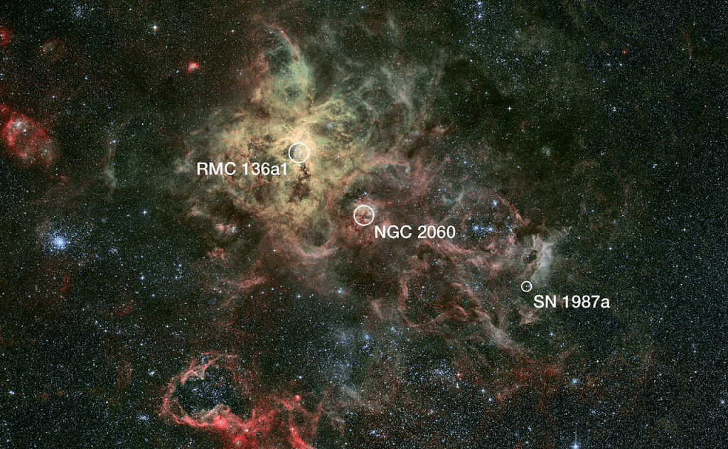 Annotated wide-field view of the Tarantula Nebula (ground-based image): NASA, ESA, ESO