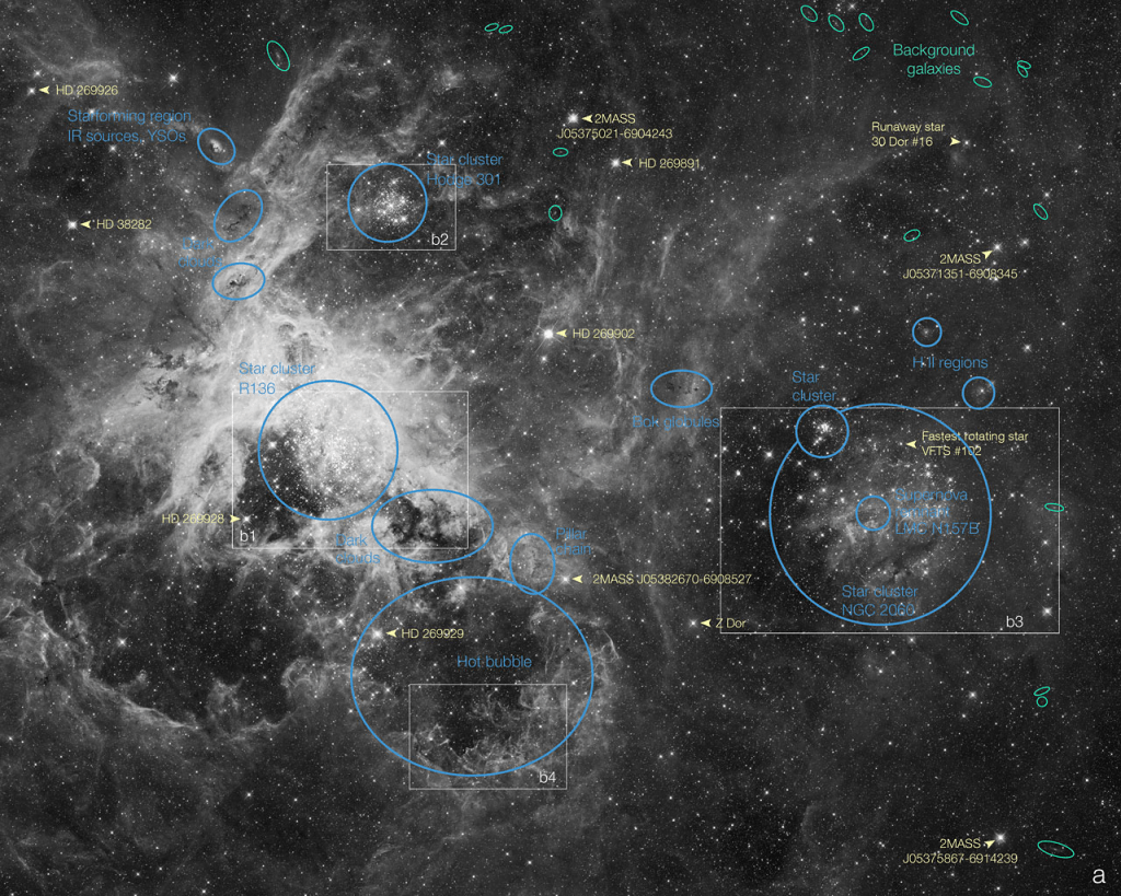 Hubble’s panoramic view of a star-forming region, Labelled view of the Tarantula Nebula, Close-up images of features in the Tarantula Nebula: NASA, ESA, ESO, D. Lennon and E. Sabbi (ESA/STScI), J. Anderson, S. E. de Mink, R. van der Marel, T. Sohn, and N. Walborn (STScI), N. Bastian (Excellence Cluster, Munich), L. Bedin (INAF, Padua), E. Bressert (ESO), P. Crowther (Sheffield), A. de Koter (Amsterdam), C. Evans (UKATC/STFC, Edinburgh), A. Herrero (IAC, Tenerife), N. Langer (AifA, Bonn), I. Platais (JHU) and H. Sana (Amsterdam)