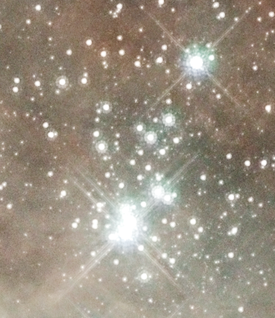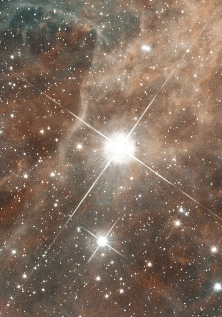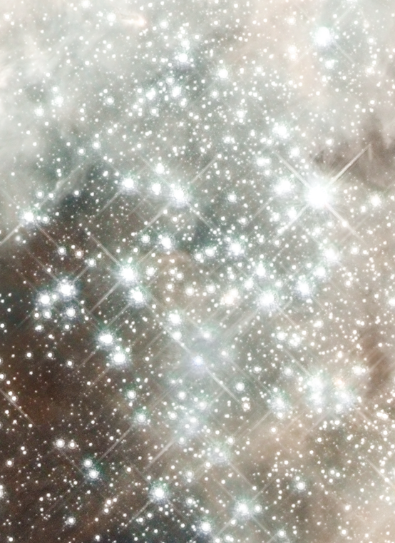 The stars within NGC 2070 are less than two million years old. Several of the stars within its dense core are as massive as a hundred suns. The neighbouring Hodge 301 cluster has stars between 20 and 25 million years old. Many of these are ageing, red-giants on the verge of going supernova, shedding their outer shells in violent explosions. The outer layers of exploded stars are ramming into the furious winds from NGC 2070, resulting in a wave of star formation between the two star clusters.