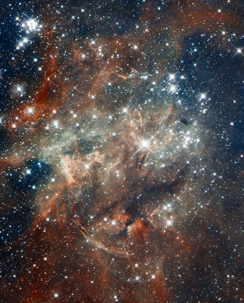 30 Doradus, R136, Tarantula Nebula: NASA, ESA, J. Walsh (ST-ECF), Acknowledgment: Z. Levay (STScI), Credit for ESO image: ESO, Acknowledgments: J. Alves (Calar Alto, Spain), B. Vandame, and Y. Beletski (ESO), Processing by B. Fosbury (ST-ECF)
