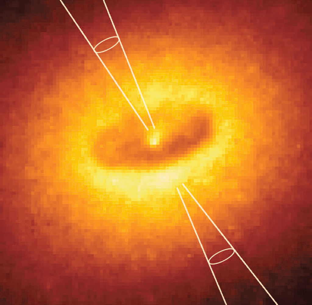 The jets stretch across thousands of lightyears, carrying more energy in a second than a billion trillion supernovas. The features of the jets are not symmetrical, and are driving massive lobes of superhot gas, or plasma. Researchers suspect that a merger with another galaxy dumped an excess of gas and dust into NGC 4261, resulting in the formation of the spectacular accretion disks and the bright black hole.