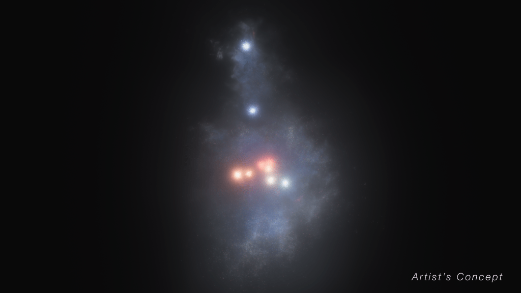 The Firefly Sparkle galaxy flickered into existence less than 600 million years after the Big Bang. 10 star clusters are embedded within the warm glow of background stars in the young galaxy. Firefly Sparkle got its name thanks to these glittering star clusters. Each of the clusters are in different stages of star formation. The other galaxies discovered at the dawn of time are much larger.