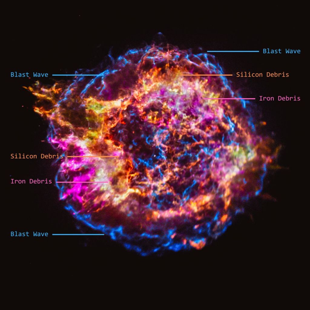 X-ray, Optical, & Infrared Images of Cassiopeia A: Credit: X-ray: NASA/CXC/SAO, NASA/JPL/Caltech/NuStar; Optical: NASA/STScI/HST; IR: NASA/STScI/JWST, NASA/JPL/CalTech/SST; Image Processing: NASA/CXC/SAO/J. Schmidt, K. Arcand, and J. Major