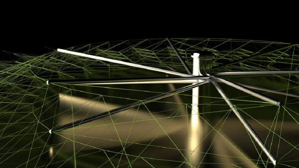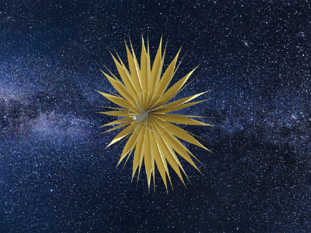 Radial arms snap outward, 36 carbon-fiber trusses coated treated with nickel-titanium memory metal, heated by coils powered by thorium. Centrifugal forces do the heavy lifting, stretching out the arms to 500 metres each, forming a skeletal starburst. Graphene-silicon membranes unfurl between them, 10 microns thick. This gossamer material is reflective on one side and absorbent on the other. Micromotors pool the sheets, that are stretched taut with help from the spin. Piezoelectric actuators kill any ripples. The structure, a kilometre across, is a jagged disk.