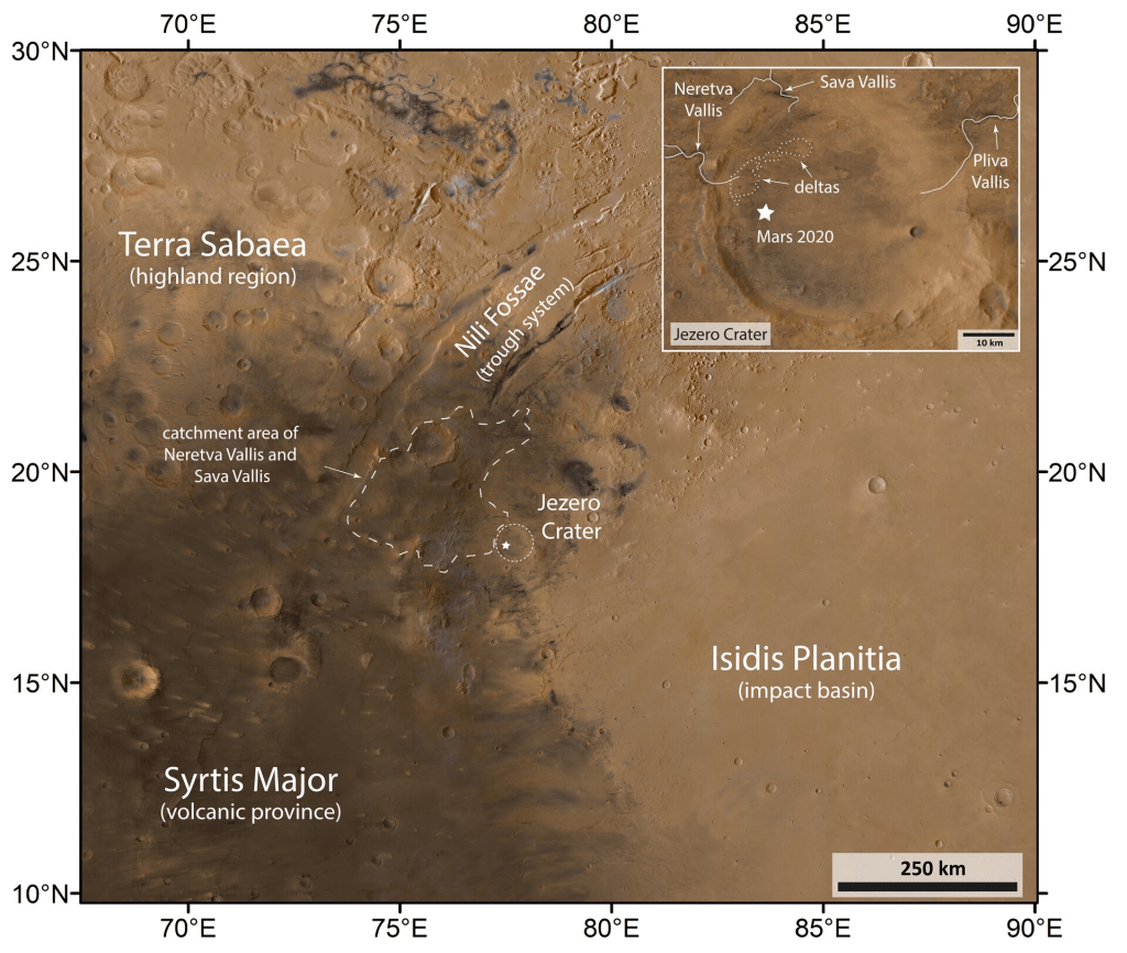 The Jezero Crater on Mars is an incredible location to investigate the past of Mars. It lies on the edges of Isidis Planitia, the third largest impact feature on Mars, formed about 3.9 billion years ago during the chaotic infancy of the Solar System, from an impactor measuring 200 km wide. Jezero crater is located on the fringes of an ancient Martian ocean, sandwiched between highlands, a river delta and a volcanic province. The dark regions have rolling dunes of dark volcanic dust.