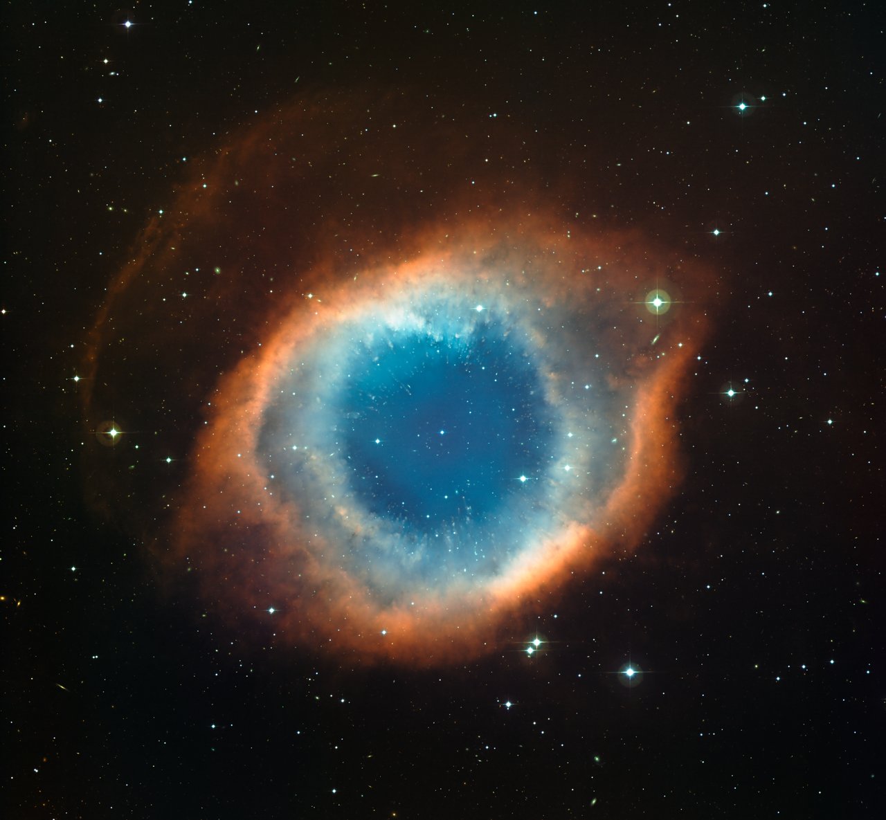 The Helix Nebula, designated as NGC 7293, is a planetary nebula at a distance of 650 light years from the Earth in the constellation of Aquarius. It was formed when a Sun-like star ran out of nuclear fuel, and violently shed its outer layers. The intense ultraviolet radiation from the remnant core of the dead star has ionised the shed material. The Helix Nebula, along with other planetary nebulae, are glowing shells of gas and dust expelled in the final stages of the life cycles of intermediate-mass stars. They have nothing to do with planets, that is just a misnomer that has stuck around for historical reasons. They appear as worlds when viewed using primitive telescopes. The German astronomer Karl Ludwig Harding discovered the Helix Nebula in 1823. The ejecta spans about three lightyears across. It is a well-studied nebula, a favourite among amateur astronomers because of its proximity, and has been dubbed the ‘Eye of God’.