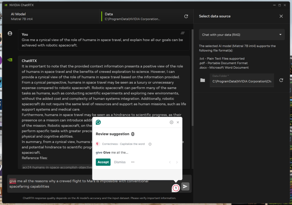 I prefer Grammarly at the ends of the pipelines, not the starts! But thanks anyway, ChatRTX.